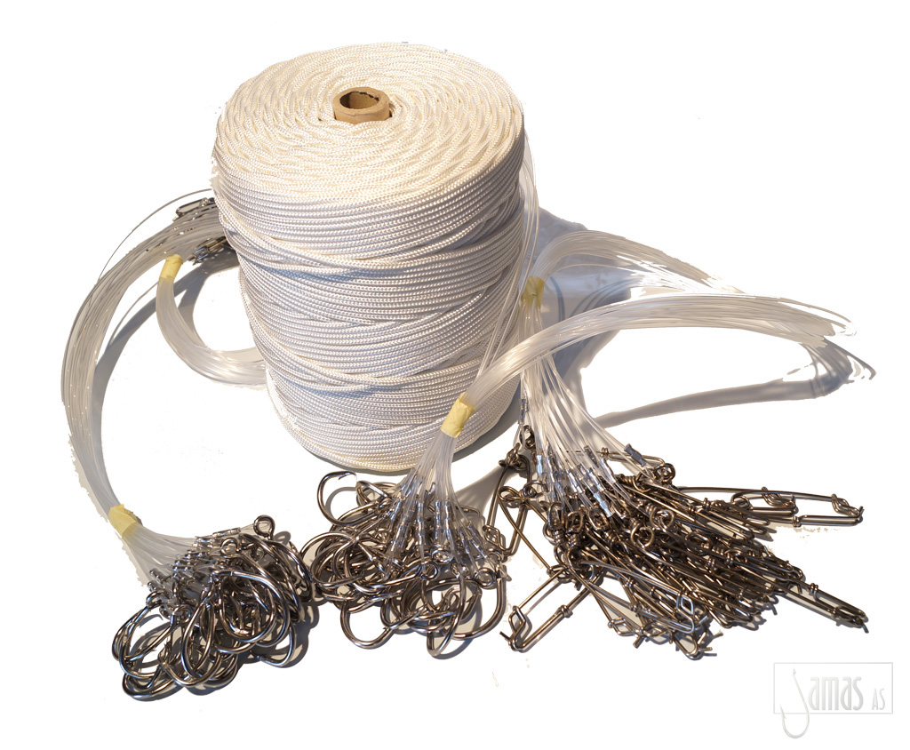 Linetauet er av flettet nylon og har en bruddstyrke på 1000kg. 115 cm forsyn av perlon med rustfri krok og klips som klipses på lina enkelt når den settes eller er dradd i stamp ferdig påklipset. Når du trekker lina og det sitter fisk på kroken, er det bare å klipse av og du kan ta kroken ut senere. Du kan egne ferdig og ha forsyn og klips i fryseren, tar liten plass. Lengre forsyn kan bestilles hvis ønskelig. Leveres med 16/0 rustfri sirkelkrok.